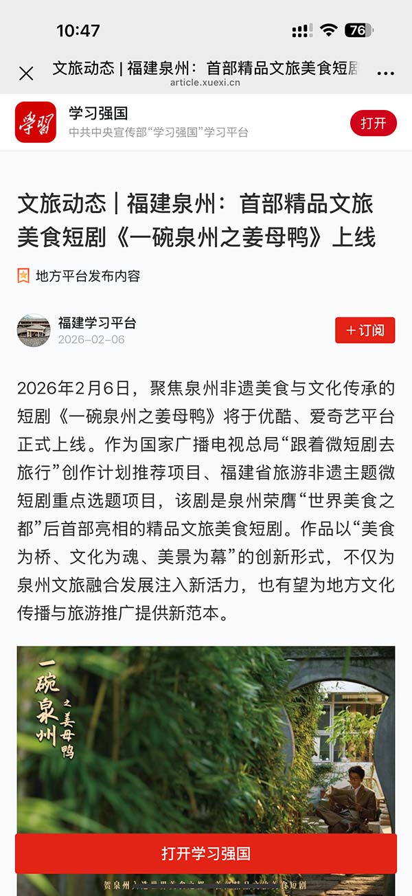 《一碗泉州之姜母鸭》获各级官媒点赞,既是对作品文化价值的肯定,也是对泉州推动文旅融合创新发展的认可。在文旅宣传不断创新的当下,这部泉州获评“世界美食之都”后首部精品文旅美食短剧,以大众喜闻乐见的形式,让非遗文化走出街巷、走向大众,让文化故事更有温度、更具传播力。