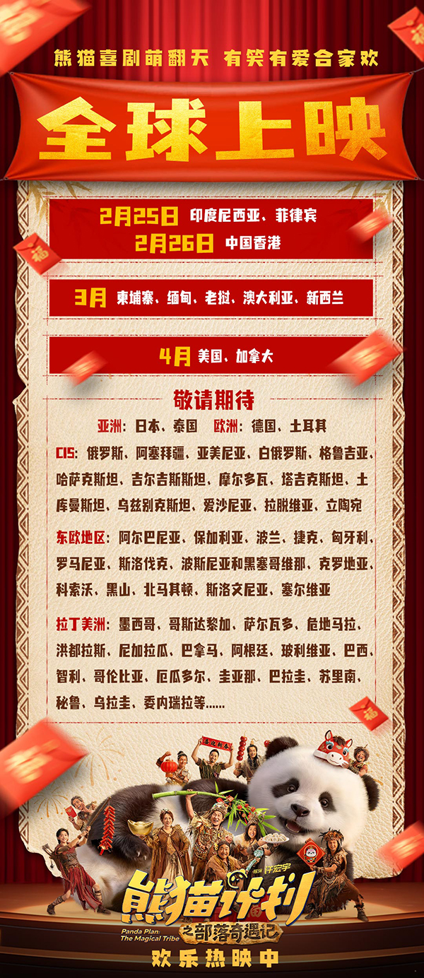 随着东南亚及港澳地区的热度持续发酵,电影《熊猫计划之部落奇遇记》的全球版图正在迅速扩张。片方也公布了后续更为详细的全球上映计划。3月,影片将陆续登陆柬埔寨、缅甸、老挝、澳大利亚、新西兰影院,并于4月与美国、加拿大、俄罗斯观众见面。作为“熊猫计划”IP的最新力作,其强大的全球影响力早已得到验证。该系列前作《熊猫计划》此前已成功覆盖亚洲、欧洲、北美等五大洲核心市场,发行版图扩展至超39个国家及地区,为续作的全球征程奠定了坚实基础。继承了这一卓越的IP基因,《熊猫计划之部落奇遇记》的海外发行一启动便气势如虹,各大片商争相抢购,目前仍有多个国家和地区的发行商正在积极洽谈,纷纷抛出橄榄枝,期望加入这场“部落冒险”的全球狂欢。发行势头之踊跃、抢购热情之高涨,均远超预期,充分彰显了“双国宝”IP的全球号召力。后续影片也有望登陆更多亚欧国家及拉丁美洲院线。从亚洲到欧美,从大洋洲到俄罗斯,《熊猫计划之部落奇遇记》正跨越山海,将中国故事特有的温暖与欢乐,以及“陪伴与团圆”的普世情感,化作欢声笑语,传递给全球每一位观众。