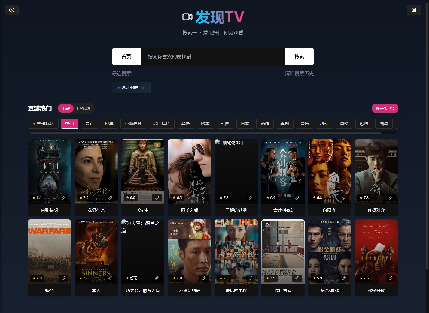 发现TV,一个免费在线影视搜索与观看平台,支持多个影视源搜索与观看,无需注册即可使用。